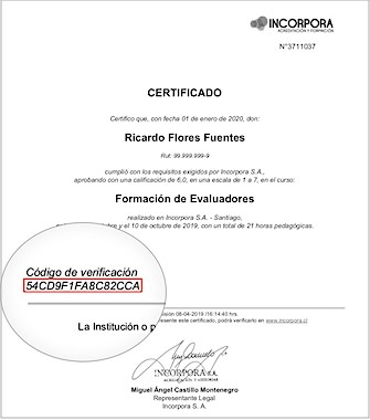 Para validar los Certificados o Diplomas emitidos por Incorpora debe ingresar el Código de Verificación que se encuentra indicado en la imagen de ejemplo y a continuación hacer click en el botón Validar.